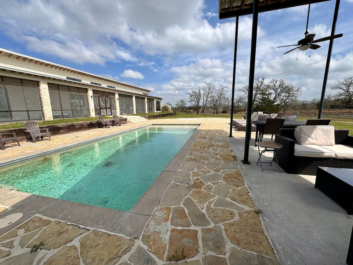 This gorgeous home is set on 42 acres and is located 6 miles from Round Top Square. The modern floor plan is open in the common areas and has a pool, summer kitchen with grill, a pond, and a screened porch that spans the back of the house. This picture-perfect property's prime location is great for enjoying local shopping, music, festivals/events or enjoying the quiet solitude of the country. Whether traveling with family, friends or girls trip, this home can be your own idyllic hideaway.