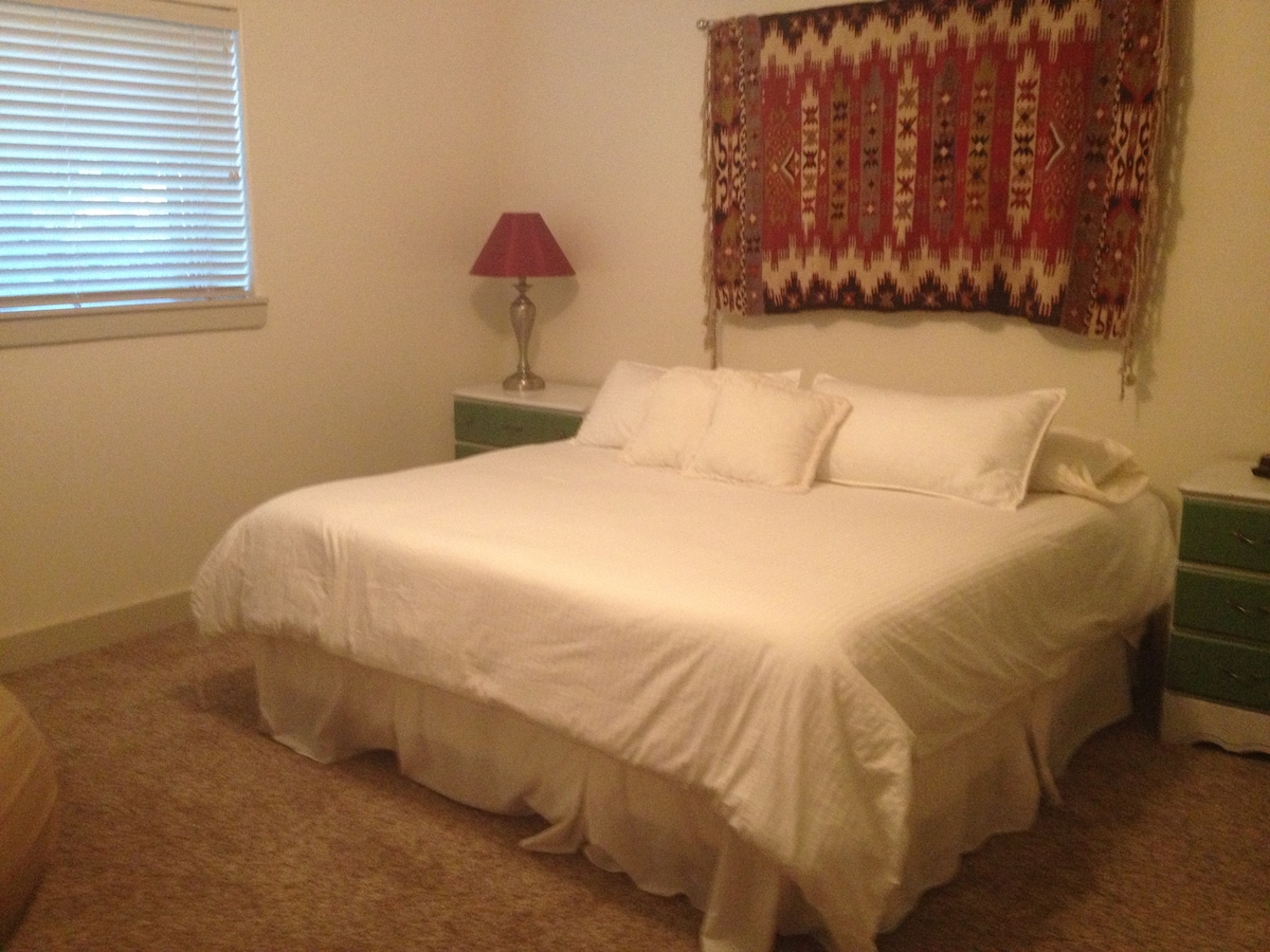 This Booking's Amazing! You'll love it! This upstairs Room is a Master Suite! It has a Queen bed, 6 ft Garden Bathtub & Separate Shower. There's a space heater in winter & small work table & Chair. You have Your own Washer, Dryer & mini-Refrigerator with a little table & two chairs in the Walk-in-Closet. Breakfast is simple & convenient, cereal, bread, fruit, Almond milk, Yogurt, Cream Cheese. It's just there if you need it. There's a nice picnic area in the back yard as well.