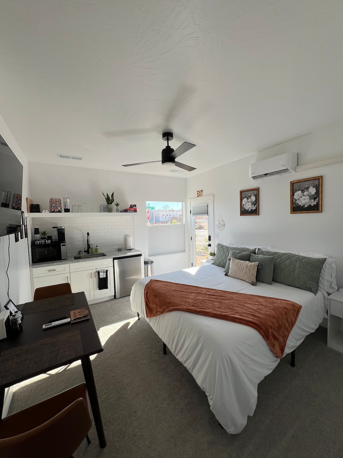 After a day of adventures, come recharge and relax in this calm, stylish space! Intention and attention to detail was poured into this home away from home. From the start of the day to the very end, this Bryce Canyon themed 1-bed, 1-bath casita has all of the amenities a couple travelers need, including stackable washer and dryer (laundry pods too), microwave, mini fridge, dishware, and TV with Netflix. Centrally located with convenient access to Sand Hollow, Quail Creek, Snow Canyon, and Zion.