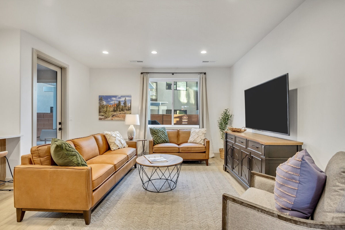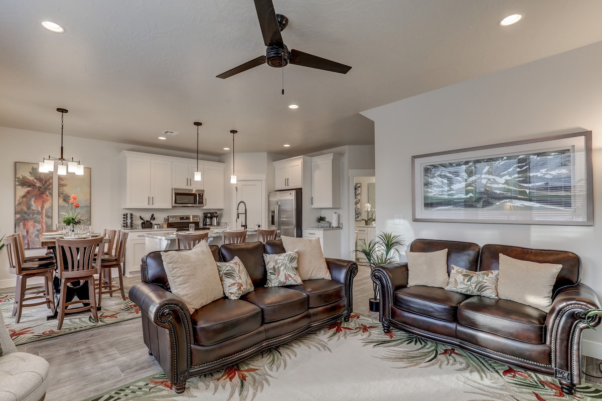 New listing, St. George/Washington City (formerly RAD retreat on Airbnb) • Private back patio with hot tub and gas firepit • BBQ • Community Pool • Close to Zions National Park, Sand Hollow Reservoir, Golf Courses, Tuacahn Outdoor Amphitheater, ATV trails, & much more • 3 luxury beds (2 Kings, 1 queen, pull out queen in the upstairs couch and an air mattress to accommodate a few more) • Modern décor • 2 car garage • 70 ‘ Smart TV