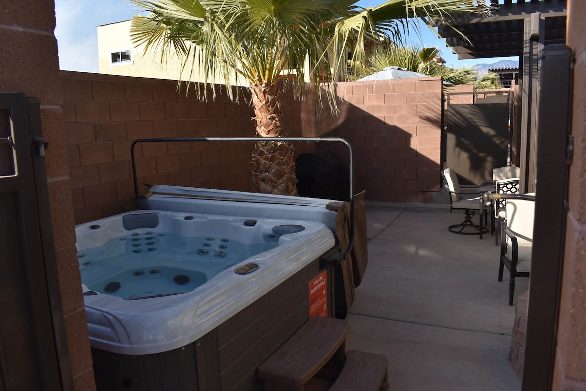 Brand New townhome is located 36 miles to Zion's National Park, and features a private outdoor hot tub, fire pit, and a heated pool! The quiet Vida Sol community is located only 2 minutes off of I-15 and 5 minutes to the St George outlet stores and Walmart/Costco. Mountain biking, walking trails and two parks nearby. ✓Private hot tub 🏊Heated Pool (Shared, heated year-round) 🛏️3BR/3BA 🛋️2 Living Rooms 👨🍳 Chef's kitchen 📶Fast/Free internet 📺Smart TV's ❄️AC 🔥Fire pit 🍖Grill 🛀Big bathtub