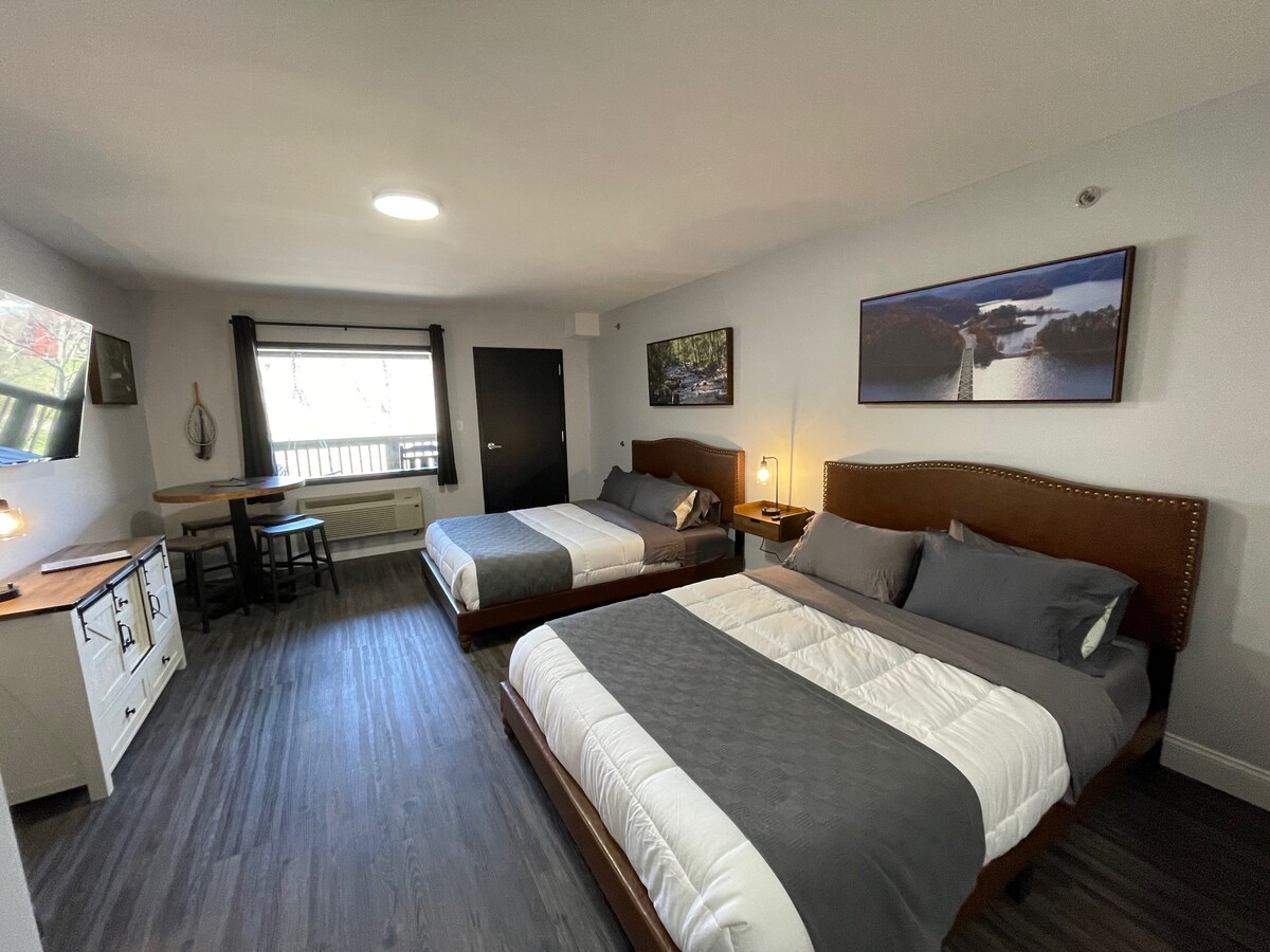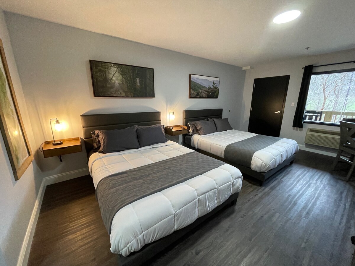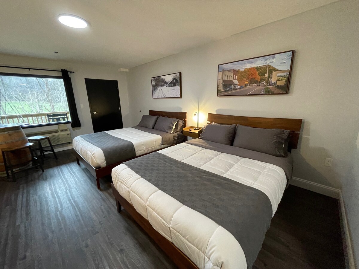 This upscale hotel suite has two queen beds & a fully stocked kitchen with full fridge & freezer, stove, oven, microwave, sink, & dishwasher. There is a table with seating for four. The back door balcony has a porch swing & two rocking chairs overlooking the Virginia Creeper Trail & Laurel Creek. The bathroom has a full walk-in shower with a sliding barn door for privacy. We provide towels, shampoo, conditioner, & soap. Each room has its own climate control for ultimate comfort.