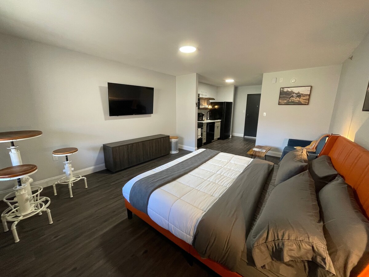This upscale hotel suite has one king bed & a fully stocked kitchen with full fridge & freezer, stove, oven, microwave, sink, & dishwasher. There is a table with seating for two. The back door balcony has a porch swing & two rocking chairs overlooking the Virginia Creeper Trail & Laurel Creek. The bathroom has a full walk-in shower with a sliding barn door for privacy. We provide towels, shampoo, conditioner, & soap. Each room has it's own climate control for ultimate comfort.
