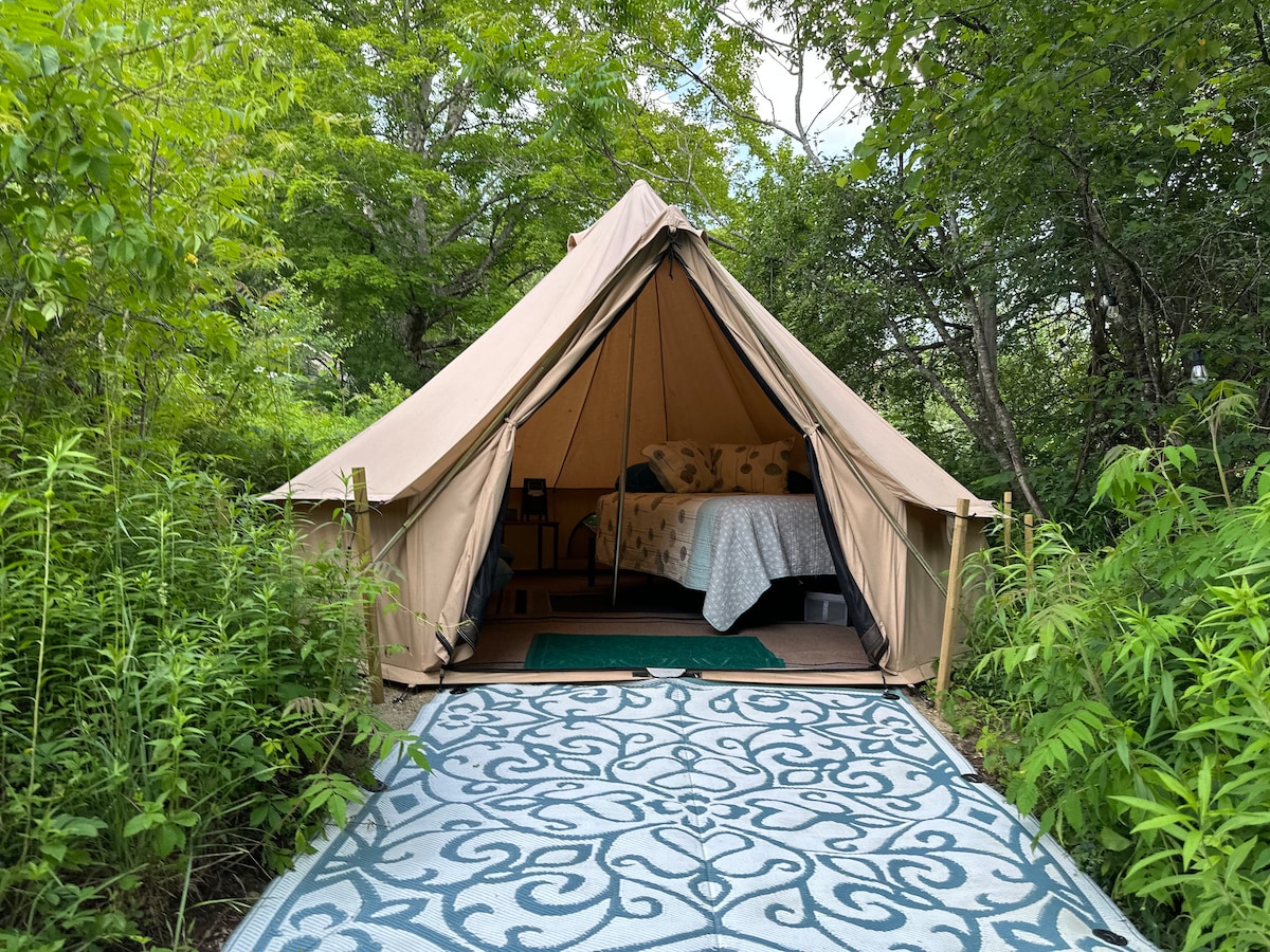 Gorgeous canvas bell tent in secluded setting, outfitted with luxuriously dressed queen memory foam bed, pillows, table, lighting, chairs, outdoor patio set + hammocks. Coffee and tea with cream & sugar avail all day. We provide drinking water, a cooler to use, everything but your clothes and meals (except breakfast, we have that covered!) *Solo Stove for a private Glampsite fire available to rent for $50/night, all wood provided. Limited inventory, must reserve, first come first served