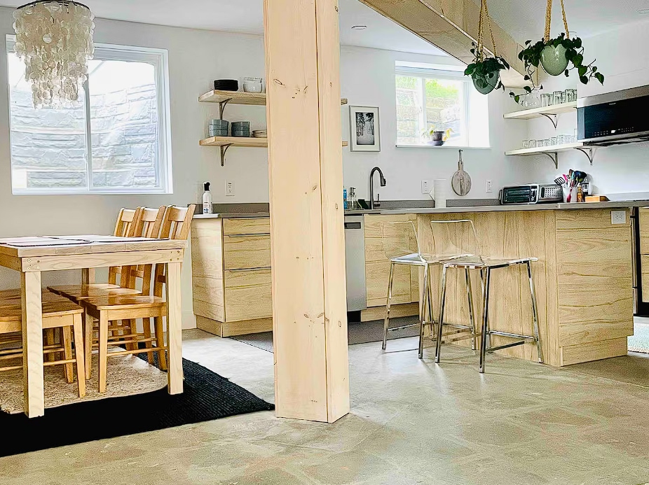 Fully renovated in 22/23 a high-end, modern, farmhouse style 2,000 sqft open floor plan condo/apt, with 2 large decks and outdoor space, with a firepit and newly installed AC and private access to Hot Tub! Perfect for entertaining and family gatherings. The living room, kitchen, and dining room are all open with lots of seating. In the summer and fall, open the doors to the expansive decks with an outdoor dining table, couch, and hammock! Enjoy family/friend time with a fire in the backyard.