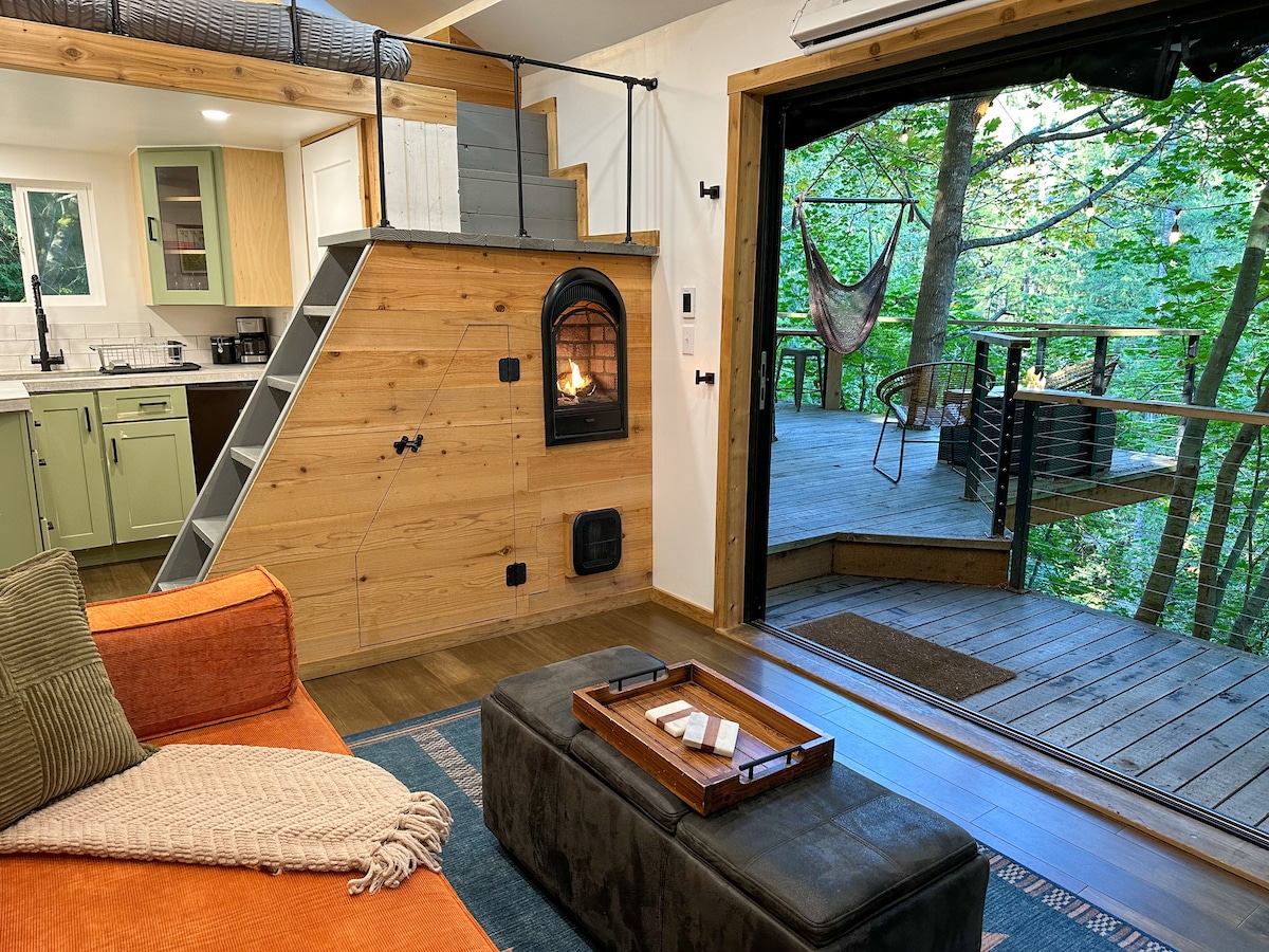 Nestled in a towering grove of 100-year-old Douglas fir’s, this custom designed treehouse provides all the amenities you would expect in a luxury Mount Rainier getaway while immersing you in the relaxing beauty of the forest from above. Read a book in the suspended net loft upstairs, cozy up in front of the fireplace to watch your favorite movie, or find inspiration at the writing desk. Located on its own half-acre private forest- the treehouse is walking distance to local businesses.