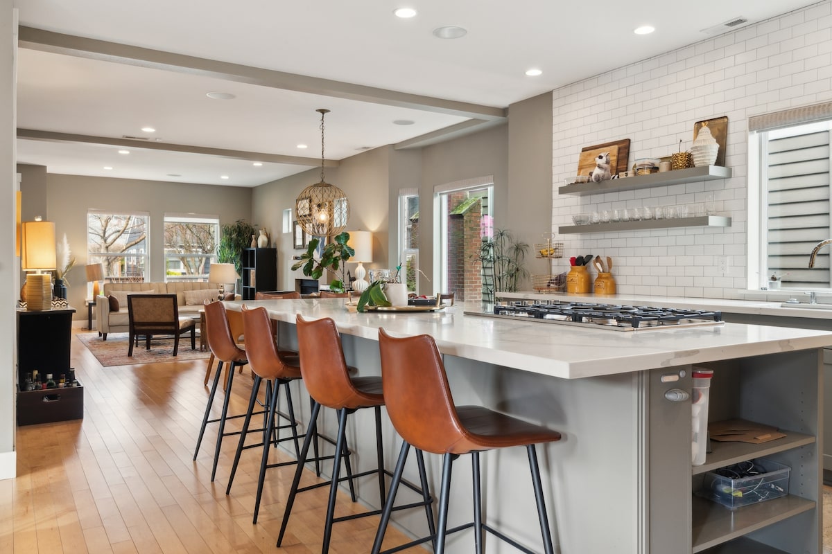 Start the day with coffee brewed in the gorgeous designer kitchen, with its cherry cabinets and granite counters. Then slide open the living room doors to drink it on the deck while admiring the Puget Sound and mountain views from this home perched two blocks above Alki Beach in West Seattle. At the end of the day, use the gas grill to prepare salmon you picked up fresh at the Pike Place Market and gather around the dining table in the great room to enjoy with a glass of fine wine. Curl up in front of the gas fireplace and unwind with a book or your favorite show on the huge smart TV. Great Room Layout: The main living space is light and airy, arranged in an open floor plan with vaulted ceilings. Leather couches ground the living room and provide a cozy space to curl up and read, work on a laptop, watch satellite TV, or enjoy the gas fireplace. From the living room, sliding doors open unto a large view deck which overlooks Alki Beach and has 180 degree views of the Puget Sound and Olympic Mountains. You'll love using the gas grill to cook the fresh salmon you bring back from the Pike Place Market. Prepare the rest of your dinner in the gorgeous designer kitchen with cherry cabinets, granite counters and stainless appliances-at the heart of the great room, then gather around the long dining table to savor a bottle of wine and great company. In the morning, enjoy a cup of freshly ground Pike Place Roast coffee while gazing at the view from the bar or cocktail table. Bedroom/Bathroom Layout: The lower level offers a master suite with king-sized bed and ensuite bath. Two additional bedrooms each have comfortable queen-sized beds and share the remaining full bath. Also included on the lower level is a laundry room, which adds convenience for longer stays. Parking: It is easy to park two cars at the unit, one inside the single car attached garage and the other in the driveway. Additional parking is available for free on the street nearby. Privacy: This rental unit is the upper portion of a duplex. The home's modern construction affords complete privacy between this and the lower unit. We are always available by text, phone, or e-mail, but otherwise respect the privacy of our guests. Alki Beach is a great place to be on a sunny day, wth families playing volleyball or exploring the tide pools as the water recedes. Parallel to the beach, there's a flat, well-maintained path, perfect for cyclists, runners, and rollerbladers. Catch a free shuttle on the beach to connect to downtown Seattle via an enjoyable ride on the West Seattle water taxi.