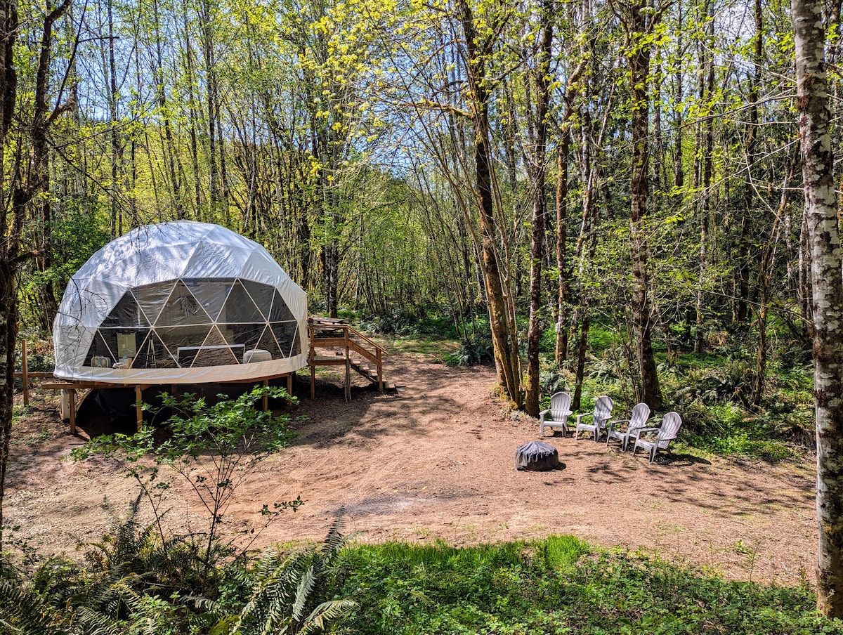 Camp in luxury without all the work! A short 10 min drive to Mt Rainier Park entrance. We are near the Nisqually river and minutes from the beautiful town of Ashford. You can enjoy a secluded, private space on 26 acres with mature trees, wildlife and a one of a kind experience in our glamping dome. Luxurious king-size bed, mini fridge, Keurig, and cozy table for 2 with games to play. Heated by an indoor propane fireplace. You'll want to experience our open air outdoor shower with nature views!