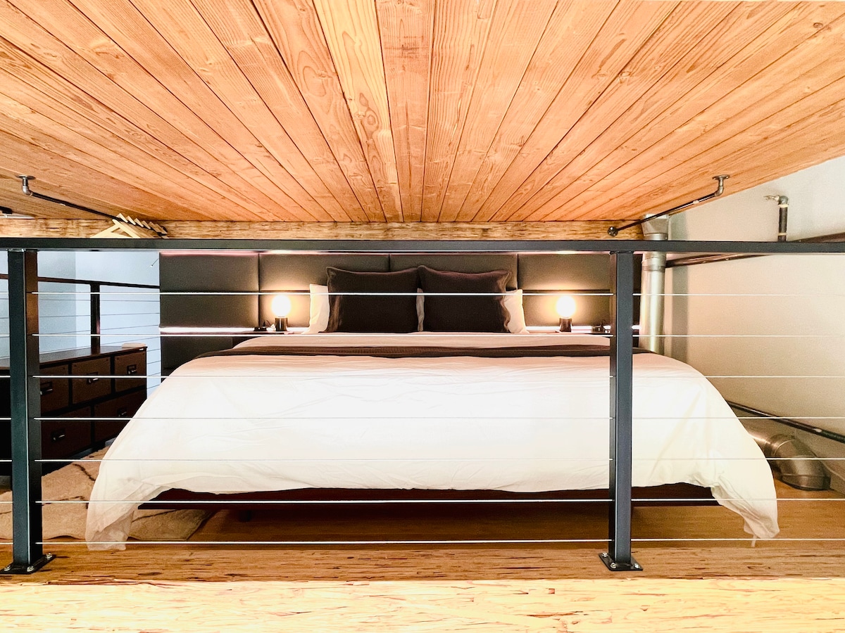 历史悠久的市中心阁楼,天花板高 16 英尺,带车库和 97 平方英尺的卫生间!