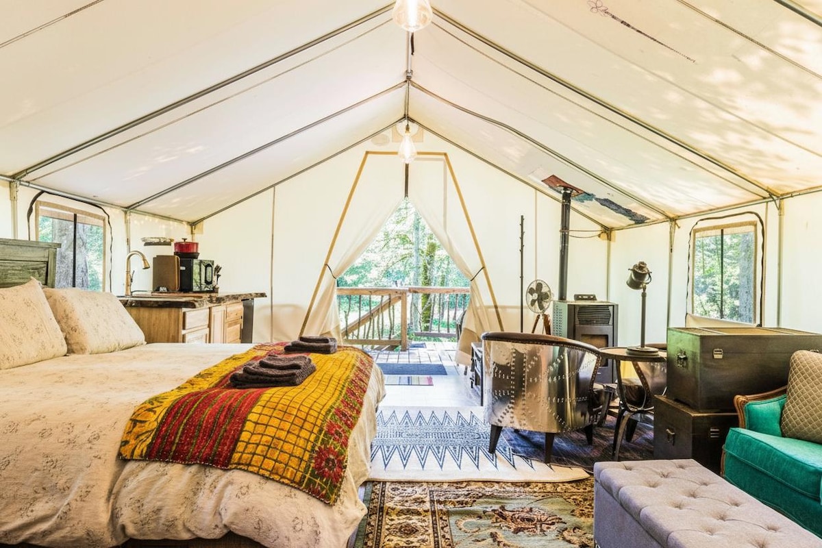 平均评分 4.92 分(满分 5 分),共 52 条评价帐篷空间,带热水浴缸,宽敞的30英亩河滨土地