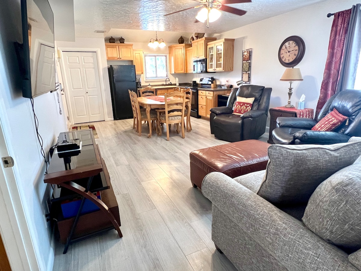 Clean,Bright updated 1 Q bed with separate bdrm plus sofa sleeper in sports village. Nice amt of storage, Sunsets on the deck, BBQ, 2 pools w/jacuzzis. Pickle ball, tennis, pool table, raqtball etc. Best location!! Bike/ATV trails, Sn Canyon, Zions, softball Complexes...all in close proximity. Long stay discounts! This is a ground level unit, no stairs, no one above. Large sink, granite, stove, W/D, spotless and quiet. Blendtec, stocked kitchen, new wood floors