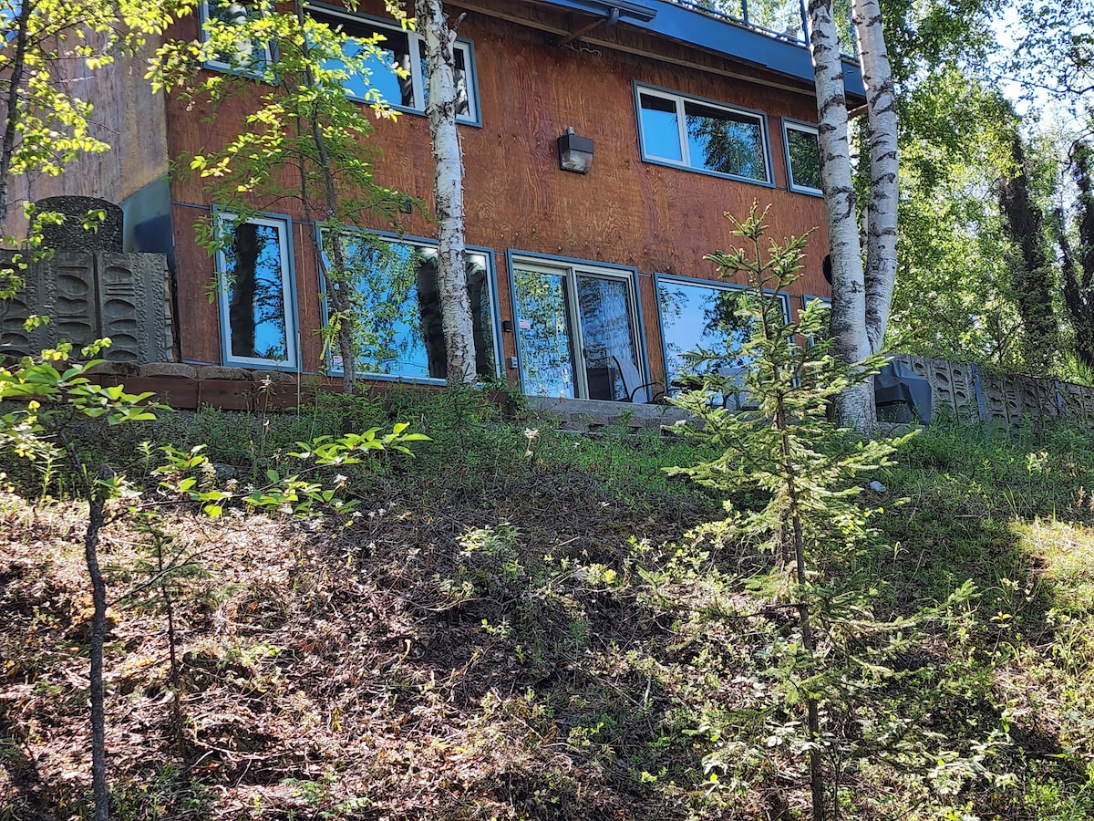 Bring your hiking boots, swim fins or computer! We are surrounded by the Talkeetna and Chugach mountains on Gooding Lake; this central location is north on the Trunk Rd between Palmer and Wasilla, and close to Hatcher Pass, and Matanuska Glacier This quiet retreat has 5G, a FULL kitchen, laundry and is perfect for refreshing yourself in Alaska. Gooding Lake has a small sandy beach and float plane access. The canoe & kayaks are free to use.. Guests must walk up a full flight of steps.