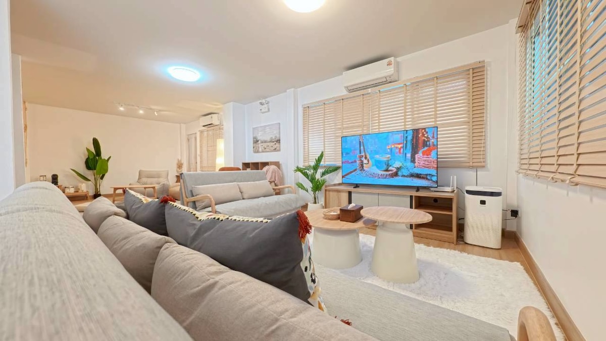 New modern luxury 3-bedroom private house at the heart of Nimman district, 10 mins from the airport, the best location to stay in Chiang Mai. The house is newly renovated and decorated by one of the most renowned architect in Thailand. Unique features include indoor garden, cozy common space, warm wooden furniture with pantry corner. Three full function stylish bedrooms with private bathrooms with full hotel amenities, air cleaners and smart TV. The house is powered by sustainable solar energy.