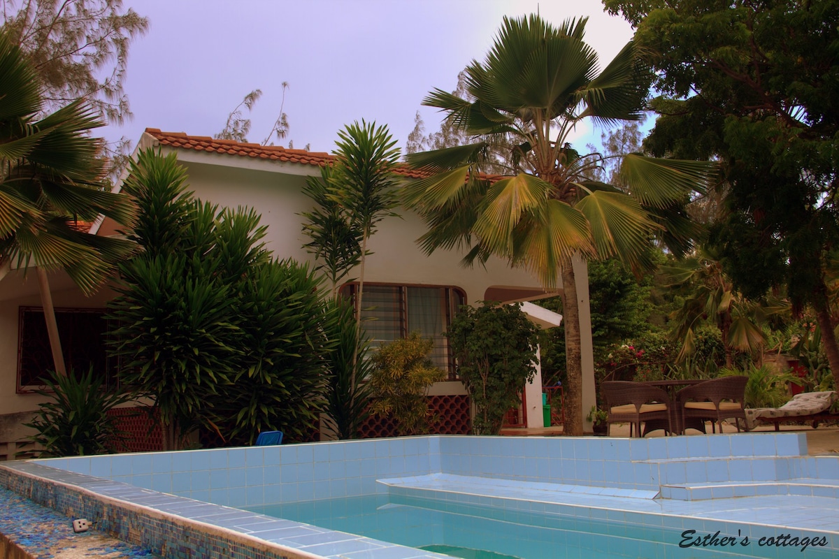 Traditional Swahili style house, stands on coral headland overlooking sea, beach, beautiful flowering gardens, private access to beach. Swimming pool recently installed, SEE HOUSE RULES Villa has 2 levels & views of Indian Ocean, private direct access to the beach, which stretches out either side, within the Marine Park. Includes 3 staff, cook, and daily room service, and gardener. Sleeps up to 10. Easily adapted and made comfortable to host smaller groups, by using just the upstairs bedrooms.