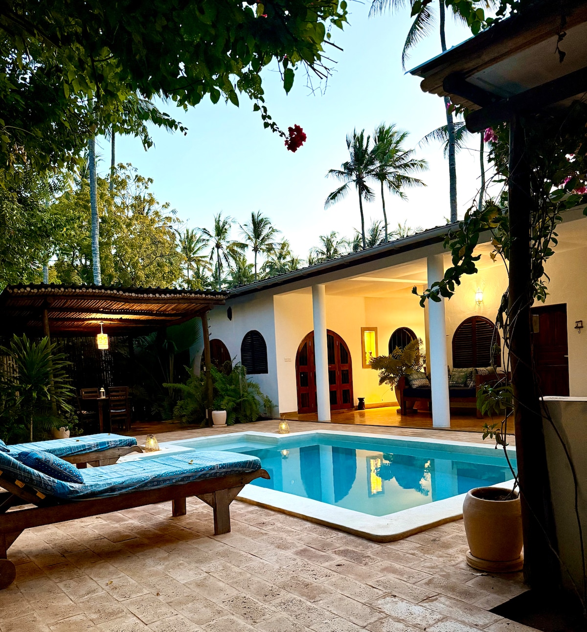 Sanjarah Cottage is a delight. It is a wonderfully designed space set in a lush garden, with two en-suite double bedrooms, a gorgeous swimming pool and a long veranda with dreamy day beds. The open plan living room and very well equipped kitchen, offers a great place to chill and the cottage is fully staffed. It’s an easy 20 min walk to the beach and a few minutes to the creek. Watamu truly is a paradise with one of the most beautiful beaches in Africa. We look forward to welcoming you soon 😊