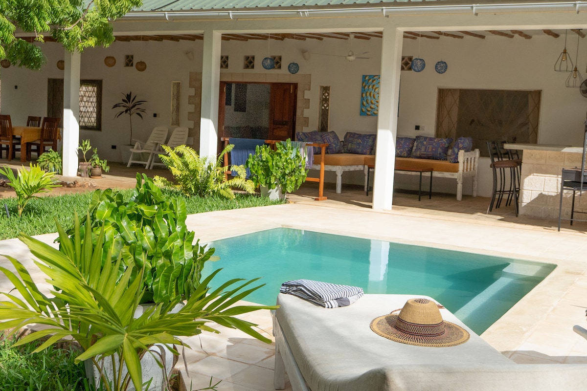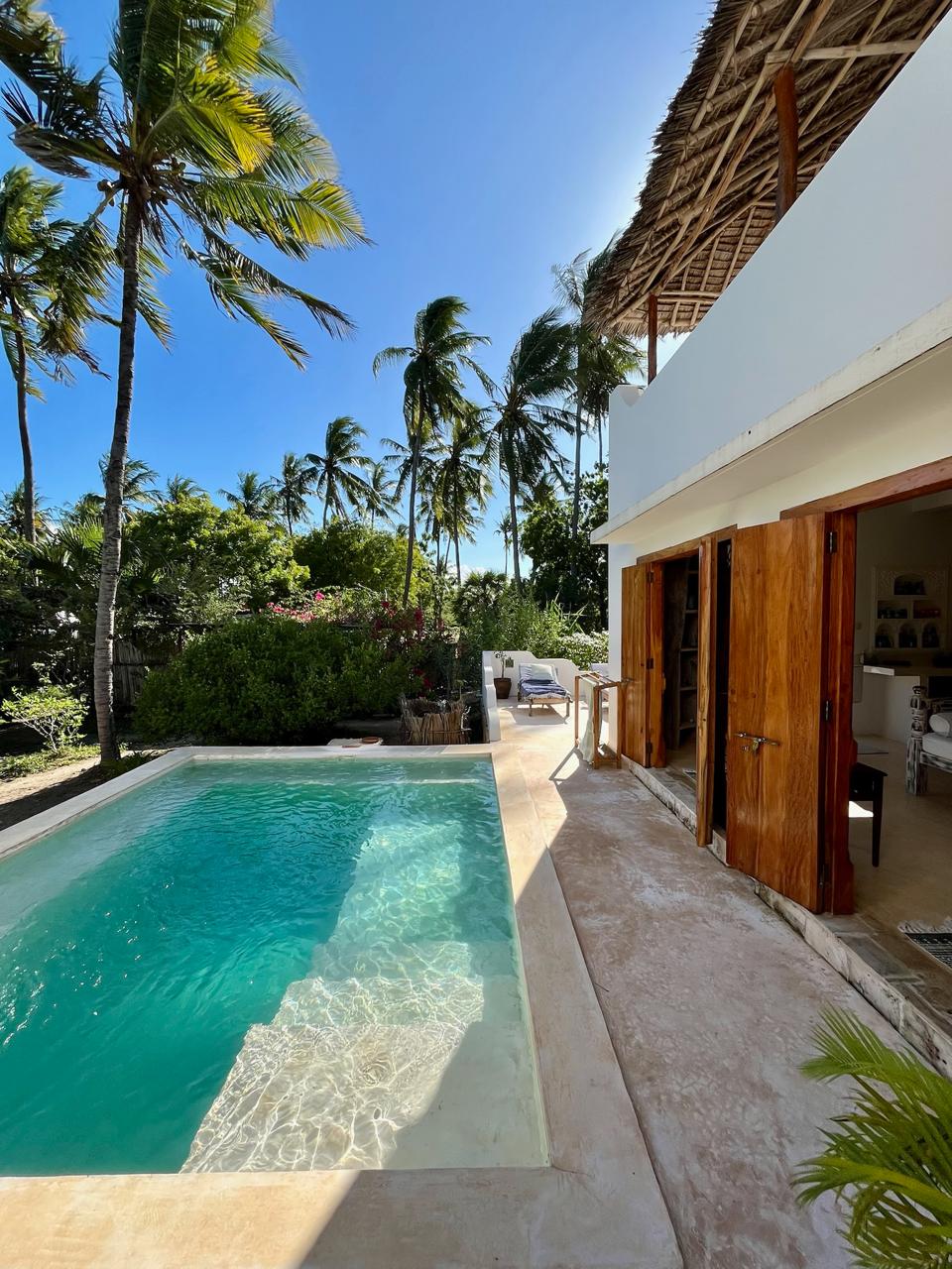 Sanjarah Cottage is a delight. It is a wonderfully designed space set in a lush garden, with two en-suite double bedrooms, a gorgeous swimming pool and a long veranda with dreamy day beds. The open plan living room and very well equipped kitchen, offers a great place to chill and the cottage is fully staffed. It’s an easy 20 min walk to the beach and a few minutes to the creek. Watamu truly is a paradise with one of the most beautiful beaches in Africa. We look forward to welcoming you soon 😊