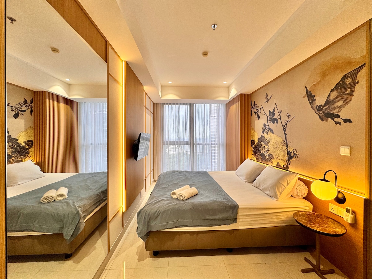 This brand new 2 bedrooms japanese apartment in Pantai Indah Kapuk fits your staycation needs from leisure trips with your loved ones to business trips with your colleagues. - 2 bedrooms - 2 bathrooms - pantry - Tatami Style living area - Seaview Balcony In addition, The apartment has 5 stars facilities from Swimming Pool, Indoor Pool, Gym, Sauna, Kids Playground, Basketball Court, and Minimarts (Indomaret & Family Mart).