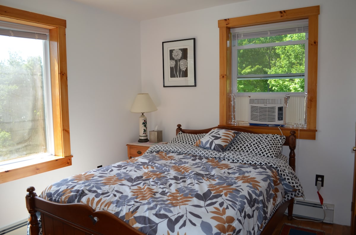 The guestroom room has a separate entrance located off a covered, back porch with a small table and chairs for summer use. There is adjustable heat and cool air from the wall mounted air-source, heat pump. The little kitchen alcove is convenient for coffee or tea or a light meal (toaster oven, single induction “hot” plate, water heater) We live in a historic building. Our neighborhood is very close to Rte 100. Waterbury village and Stowe are nearby too with skiing, hiking and biking.