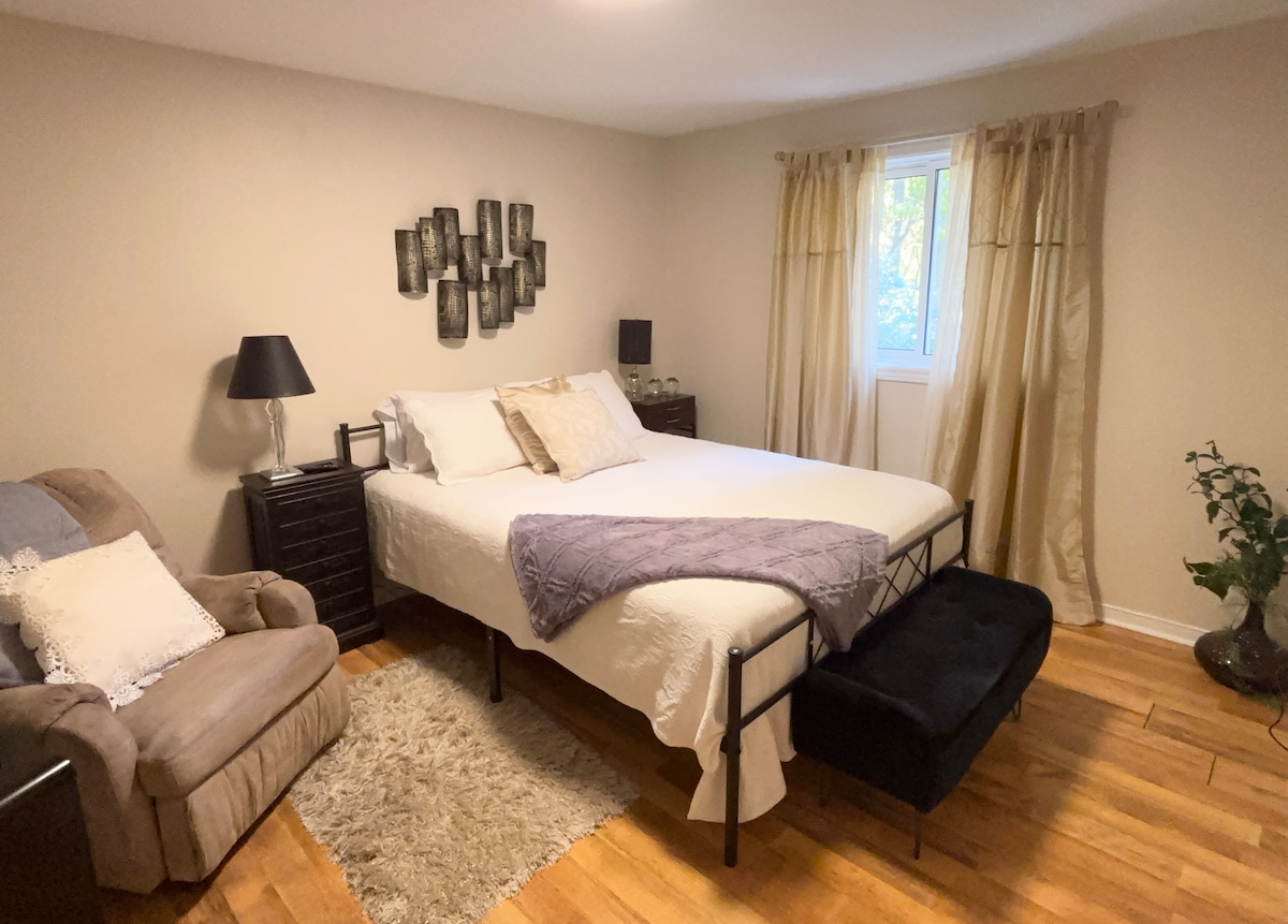 Welcome to our home! This newly renovated 2-bedroom is perfect for professionals, families, and remote workers. Both bedrooms feature king-sized beds, ensuring a comfortable night's sleep. Enjoy a calming and inviting atmosphere, a well-equipped kitchen and 100Mbps internet. Our home includes two dedicated workspaces, making it easy to work from home during your stay. With a central location just a short walk from downtown, it's the ideal home away from home for your stay in Kitchener.