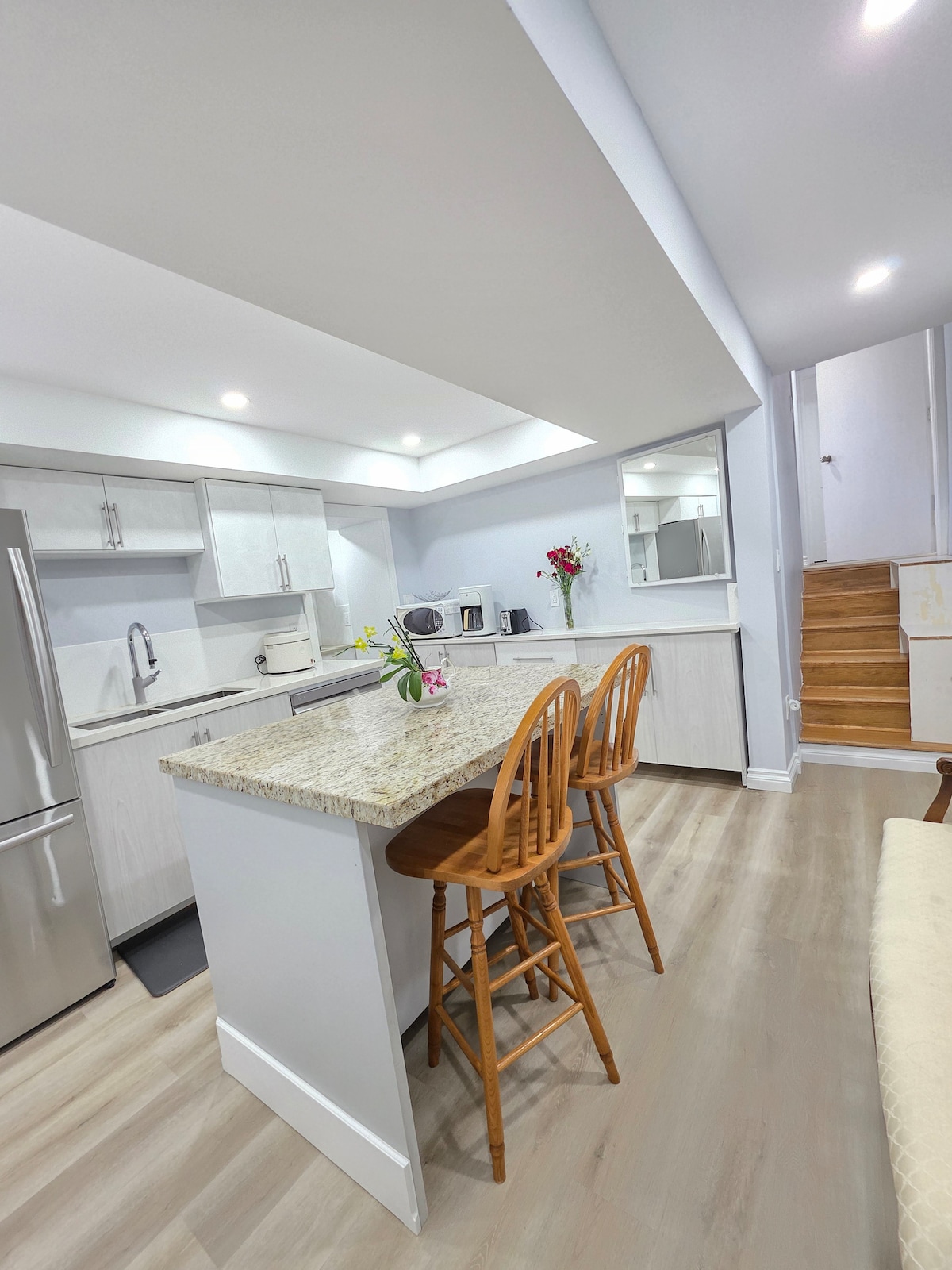 Clean, comfortable, warm newly renovated private basement apartment with separate entrance and parking. Master Bedroom includes a 42" TV, Queen size bed with new mattress/box spring and all the bedding needed for a comfortable sleep. Second bedroom contains a new futon. The Kitchen/Living Room is open concept with a new 43" TV. Kitchen is clean, modern and contains all the necessities to prepare all types of meals.