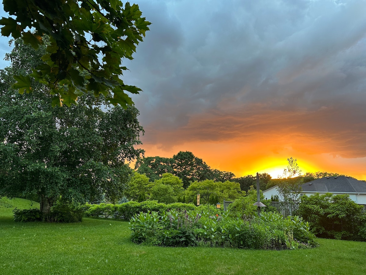 Welcome to the Sunset Loft in Guelph ON. Centrally located, you will find you are within walking distance of Downtown and can easily enjoy parks and walking trails, restaurants and breweries. Your space includes both private porch and patio and inside you will find all the amenities of home including: wifi, smart tv, 2 queen beds, full 4 piece bathroom, fully equipped kitchen, in-apartment laundry and lots of windows so you can enjoy a view of nature from sunrise to sunset.