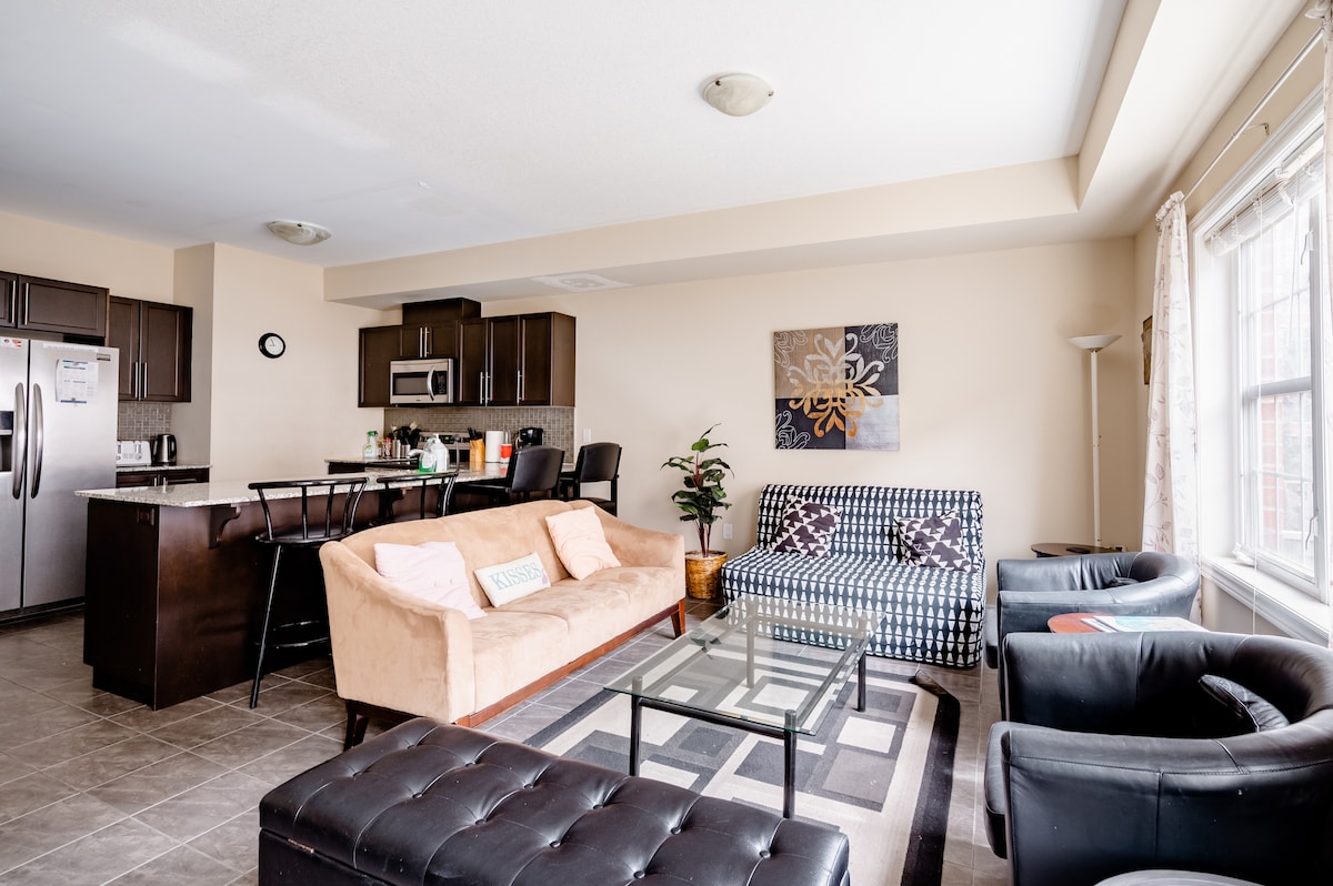 Forget your worries in this spacious and serene space. Enjoy this peaceful new townhouse with various features. A nice gorgeous view of the backyard with cozy vibes in the main floor. Gorgeous retreat in Guelph with a peace of mind stay. Spacious bedrooms with luxurious furniture in the heart of the city. Around the City: - 8 Mins from Stone Road Mall (Food, Shopping etc) - 8 Mins from University of Guelph - 8 Mins from Downtown Guelph ( Restaurants, Bars ) - 25 Mins from Halton Premium Outlet