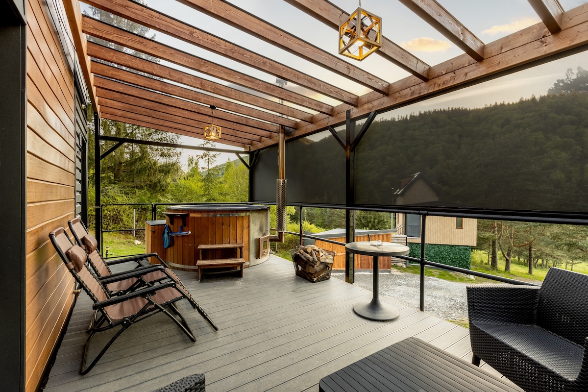 Studio shelter house o powierzchni 33 m kw. z balkonem w wysuniętym lukarnie, z pięknym widokiem na Tatry Zachodnie. Przestronne, 4-metrowe wnętrze wykończone drewnem modrzewiowym. Łóżko typu "king size" 180x200cm z opcją rozsuwania na 2 pojedyncze. Aneks kuchenny ze zmywarką, lodówką, mikrofalą, tosterem ekspresem do kawy. Rozkładany fotel-sofa o szerokości 100cm czyni studio wygodne dla 2 osób lub 2 os z dzieckiem. Wanna w otwartej przestrzeni, toaleta z umywalką w oddzielnym pomieszczeniu.