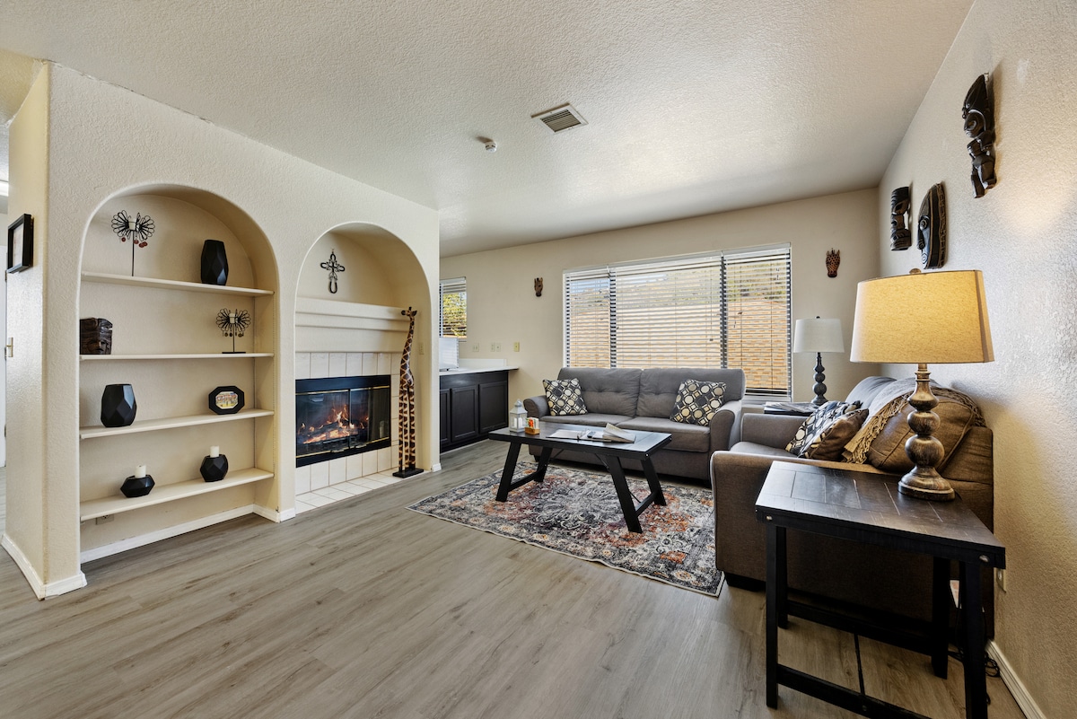 This beautifully remodeled 1914 home is two blocks from Whiskey Row and Downtown Prescott shops, theatres, restaurants, and courthouse square events. Professionally designed inviting home, two bedrooms each with a queen bed, two gorgeous bathrooms each with a full shower and bathtub, and a third private sleeping room with two twin beds. Living room has a grand accent wall, rich furniture, and a warm gas stove for restorative evenings at home. Welcome to Prescott, and welcome to our home.