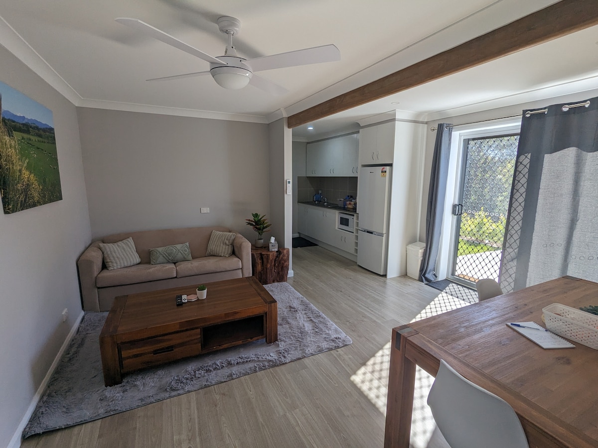 Our place is situated within an easy 5 min walk to the main street, restaurants and cafes & only 10 min walk to Town Beach. Our studio is a separate unit underneath our new in-town house. It has private access and opens up to a very large alfresco area with lawn & garden. The studio has a separate bathroom with a real shower, toilet as well as separate kitchen, fridge, hotplate & microwave. It contains a King size bed, air-conditioning, lounge sitting area and access to WIFI. Great for couples
