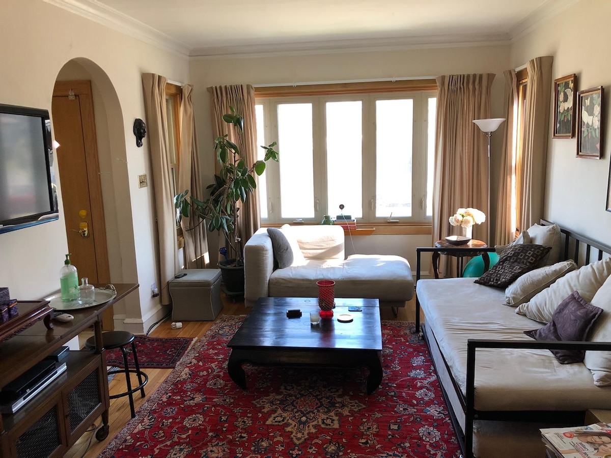 Private entrance apartment on the 2nd floor of this historic bungalow. Free street parking! Medicinal & recreational smokers permitted... outdoor ONLY. This comfortably cozy quiet get-away is nestled in NW Portage Park in a family neighborhood. Dog and kids park nearby. Fenced yard for Fido. Backyard patio w/ BBQ grill. High-speed internet. Front porch swing Easy access to buses & Jefferson Park Transit train station to Downtown & Museum Campus NO PARTIES
