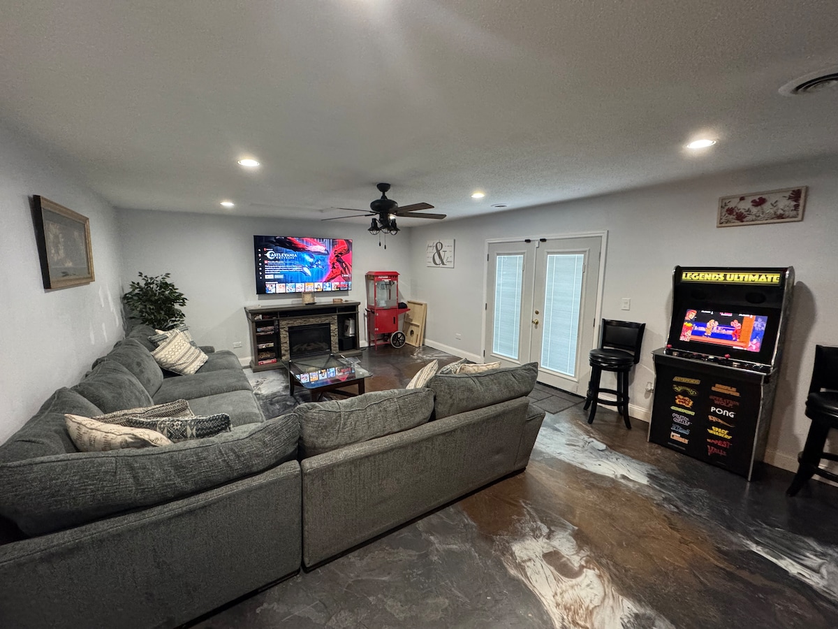 This unique place has a style all its own. This corner lake house comes with a huge fenced-in yard, as well as a balcony off of the master bedroom and 2 parking spots. We offer 3 kayaks with life jackets, 1 paddle board, paddle boat and fishing poles, fire pit, outdoor and indoor games. We have 3 bedrooms with beds included, as well as a futon couch a trundle bed and a pull-out couch bed (6 potential beds total). This comes with 2 TVs, fireplace, WiFi, bar, new fridge and more.