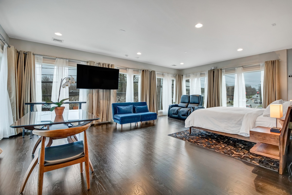 Relax & Indulge in our Luxe Penthouse Studio with Elevator & Parking! Beautifully furnished on Main St. in Warwick- Walk to Everything! Panoramic windows with amazing views over Warwick. Spa steam shower with bluetooth speakers, luxury bath toiletries, Heavenly King bed with Egyptian cotton linens, 65 in. HD Smart TV, reclining leather theater seats, velvet loungers convert into sleepers, fully stocked designer kitchen with all appliances, Nespresso & Keurig, coffee, tea, bottled water included.