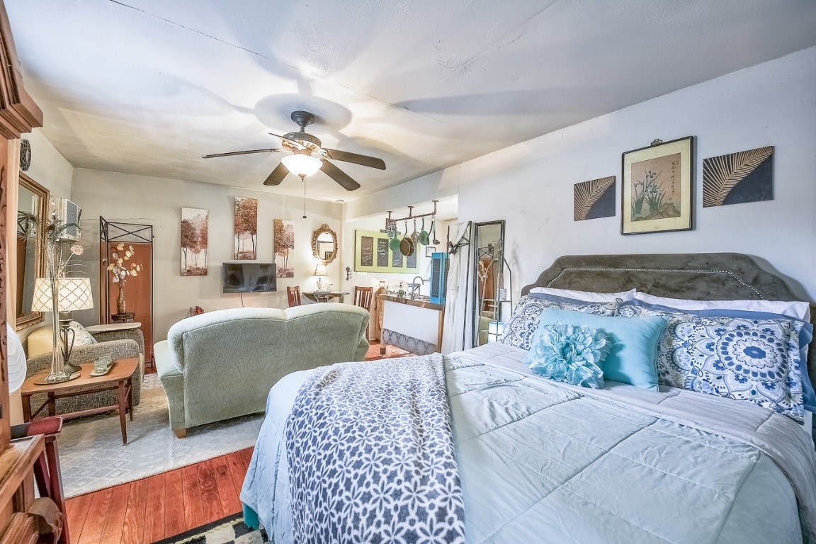 This cozy MICRO COTTAGE (850sq feet) is small in size but big on charm! Inside, you’ll find Victorian-inspired touches, a comfy sofa-futon, three snug sleeping areas, and a micro-kitchen ideal for light meals. Outside, enjoy string-lit patio seating and an 8-ft stock tank pool—perfect for cooling off in the summer time. Whether you’re looking for a restful weekend, a romantic escape, or a unique tiny-home experience, this micro-cottage offers comfort and character in a one-of-a-kind setting.