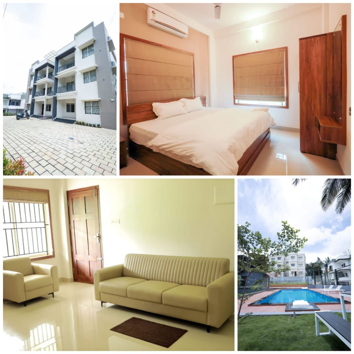 Located in the heart of Sultan Bathery with 3 floors, a pool, dining space, complimentary breakfast, barbeque & campfire. Flexible stay options for groups of all sizes. 3 ways to book your stay here: 1. Spacious 2BH flat with 1 AC & 1 Non-AC bedroom, hall, dining, and shared pool—sleeps 8. 2. Book an entire floor (2 flats ) for up to 16+ guests—private pool possible (subject to availability). 3. Book the full property (6 flats) for up to 48 guests with exclusive use and complete privacy.