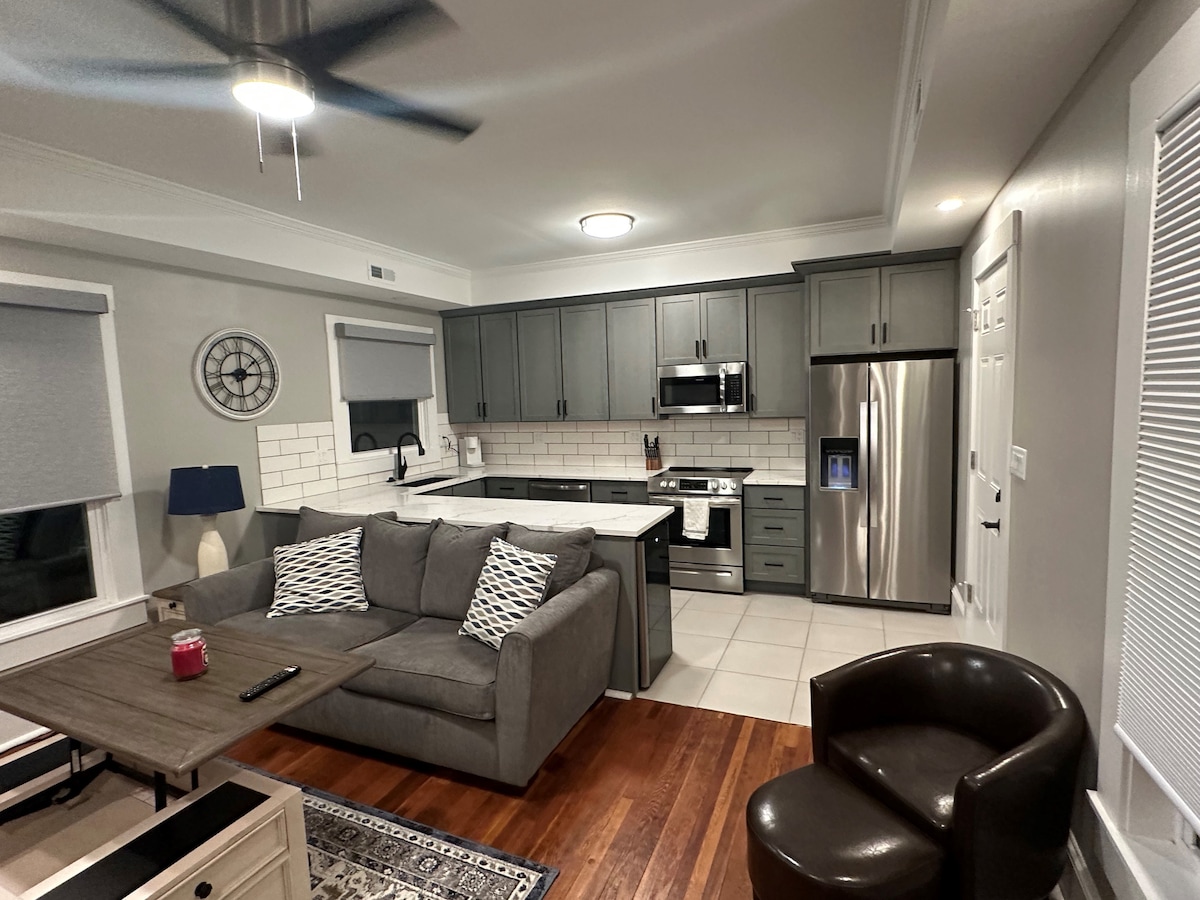 One bedroom apartment in the historic depot district of Richmond. The space has a small kitchen with full sized stove, apartment sized refrigerator, and sink. A large open room includes the kitchen, dining table, couch, seating area, and TV. Separate room contains bedroom and entry way. The apartment is equipped with Wifi. Close to Interstate 70 and Reid Hospital. The apartment is within walking distance to a brewery, restaurants, gift shop, coffee shops, two bars, bookstore, and ice cream.