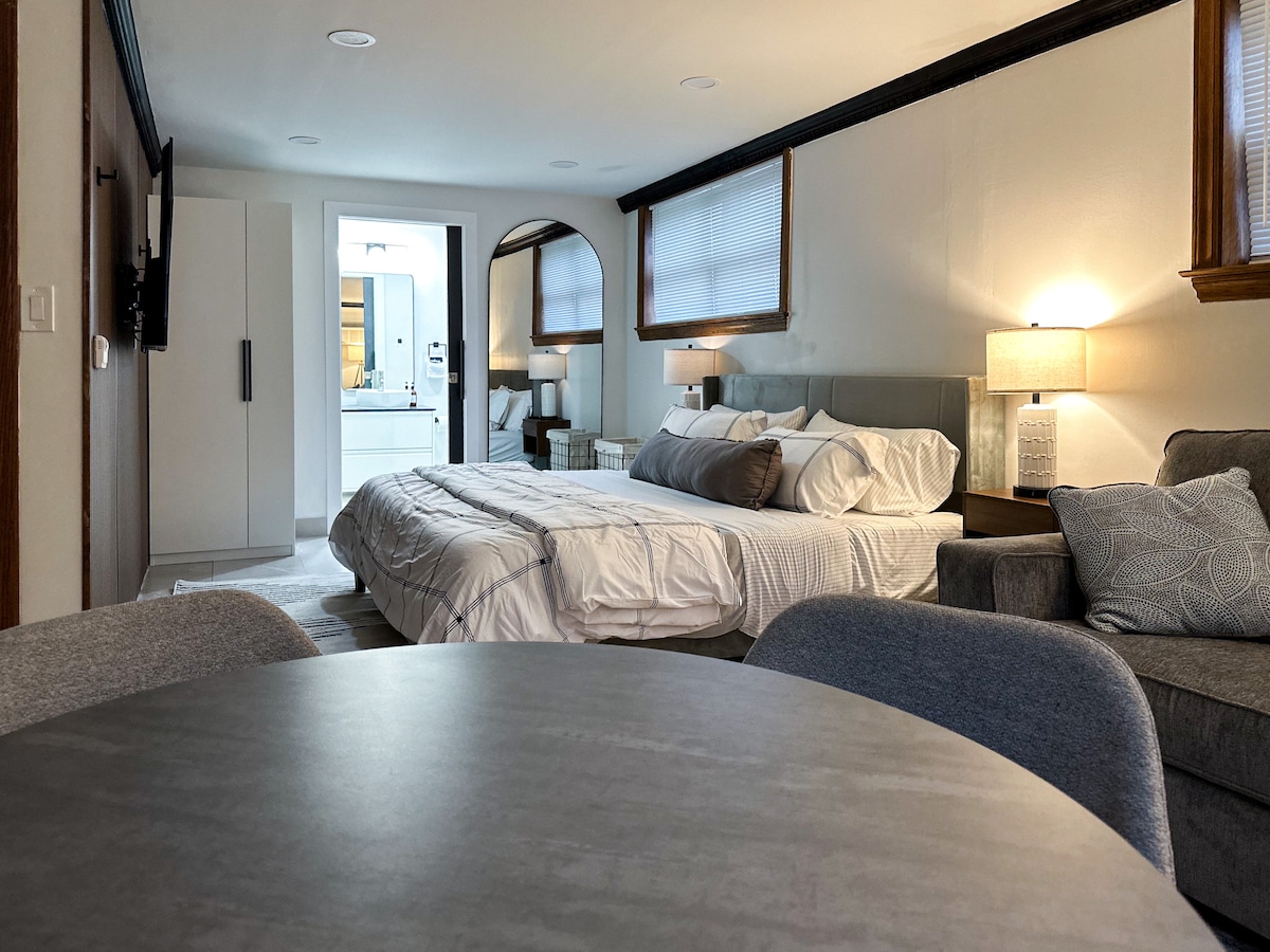 Experience a comfortable and convenient stay in this spacious 1-bedroom apartment designed for accessibility. The unit features a king-sized bed, a sofa bed for additional guests, and a fully equipped kitchenette with microwave and coffee/tea maker. The living and sitting area provides space to relax or work. Designed with accessibility in mind, this apartment includes wide doorways, a handicap accessible shower, and accessible bathroom fixtures.