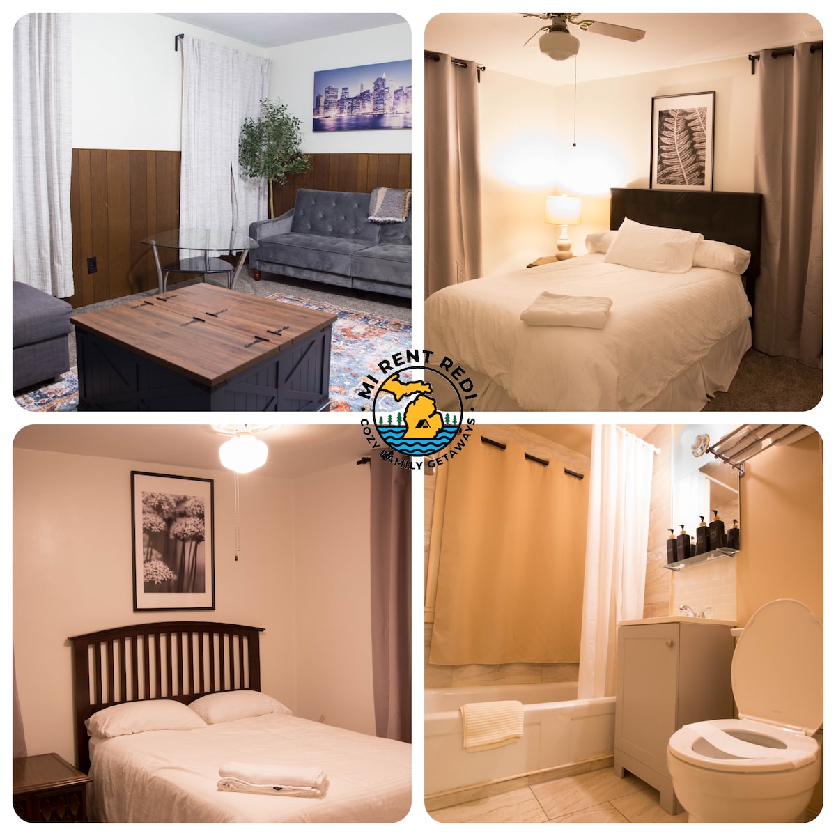 Stylish ranch. Sits on a quiet one way street just a few minutes from Detroit. High speed wi-fi and 55 inch smart TV. Spa-like bathrooms, deep soaking tub, mood lights, 2 person shower and Bluetooth speakers and towel warmer. His and Hers bathrobes. Full wetbar and stocked bar fridge. Stainless steel washer and dryer with all the supplies. 2 bedrooms, brand new Queen mattresses and linens. Towels and other linens also available. Pack and Play, large dog kennel on site. Iron firepit and chairs.