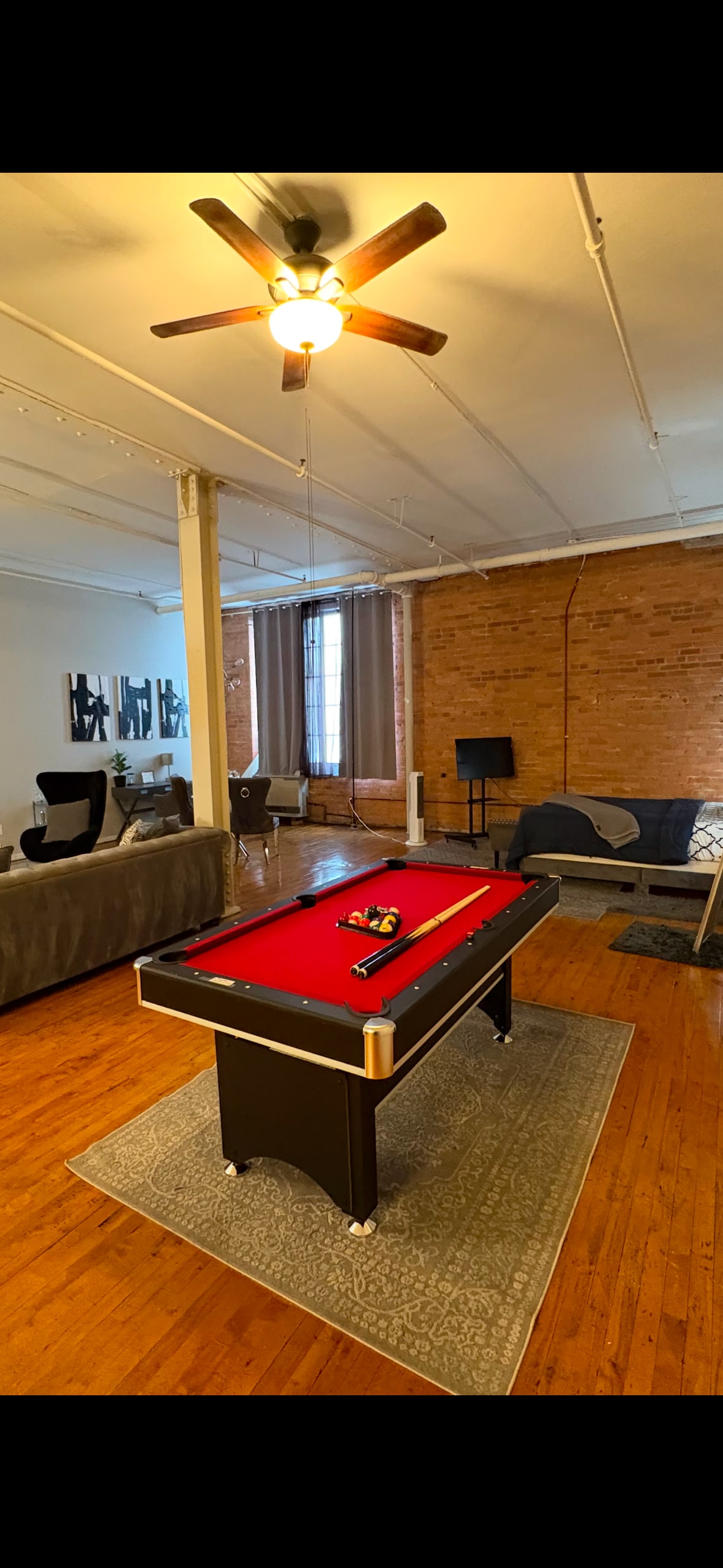 🌙 Step into a stylishly curated loft where industrial charm meets modern comfort. With soaring wood-beamed ceilings, exposed brick walls, and oversized windows, this space is bathed in natural light by day and transforms into a cozy, ambient retreat by night. ✨ Perfect for weekend getaways, extended stays, or working remotely, this loft offers the ideal balance of city excitement and homey comfort all a close distance to downtown’s dining, shopping, and entertainment.