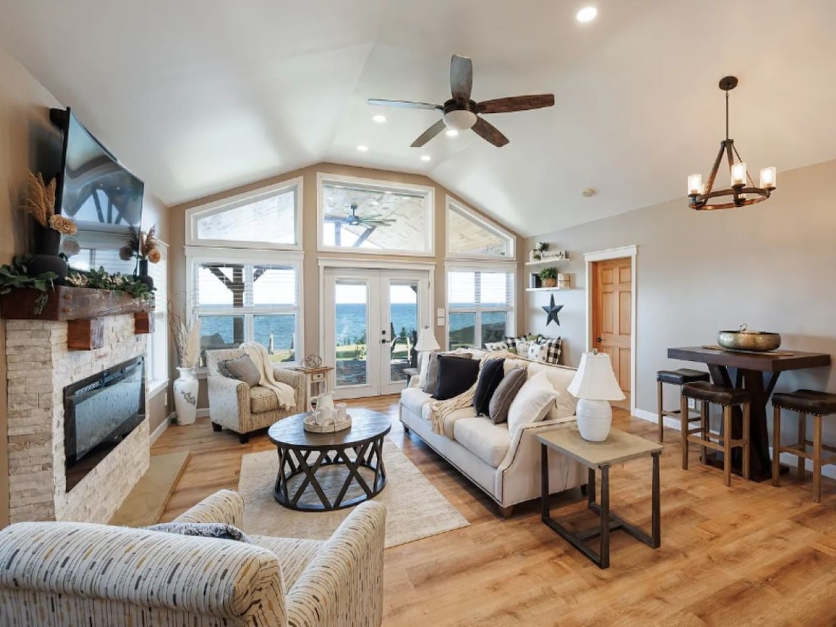 ★ "We couldn’t have picked a better place to stay. The house is beautiful and spacious." ☞ Waterfront w/ 2+ acres backyard ☞ Two-level deck w/ outdoor seating + lake views ☞ Wood-burning fire pit w/ s’mores kit ☞ Fully equipped + stocked kitchen ☞ Master suite w/ king + bathroom ☞ 2 kayaks w/ life jackets ☞ Parking → driveway (4+ cars) ☞ 75” Smart TV w/ Apple TV ☞ Electric BBQ 2 mins → Lake Ontario 60 mins → Bristol Mtn Ski Resort 90 mins → Letchworth State Park ("Grand Canyon of the East")