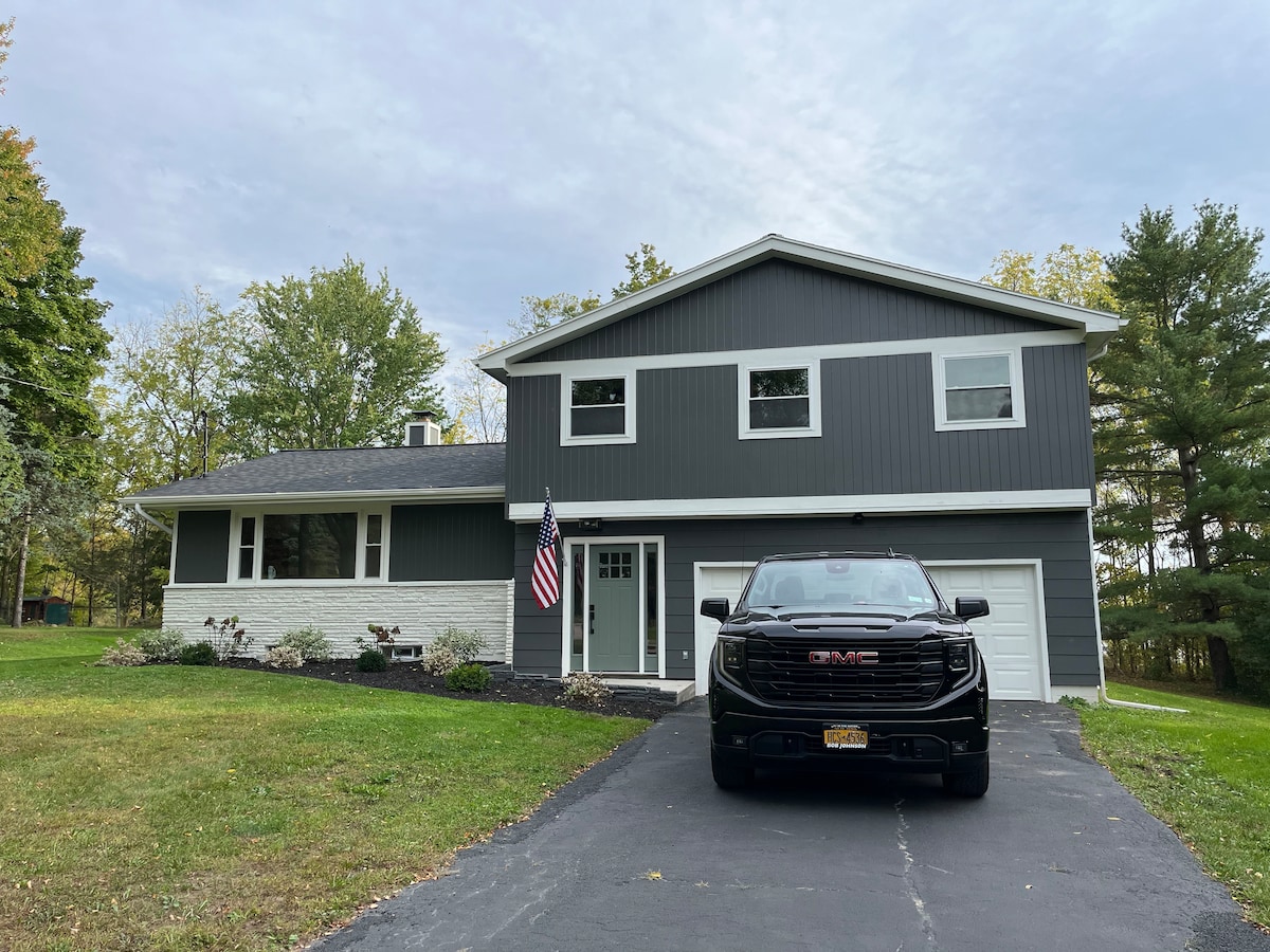 Escape to a spacious and serene 4,500 sq. ft. cabin nestled in the heart of the Finger Lakes. This stunning retreat, features 5 bedrooms, 3 bathrooms, and a game room, offering the perfect blend of rustic charm and modern comfort. Step inside to the fresh scent of pine and enjoy modern amenities. Unwind with a cocktail in the private hot tub, or explore the area’s top attractions—wineries, breweries, or nearby casino. If you’re seeking relaxation or adventure, this is your ideal getaway.