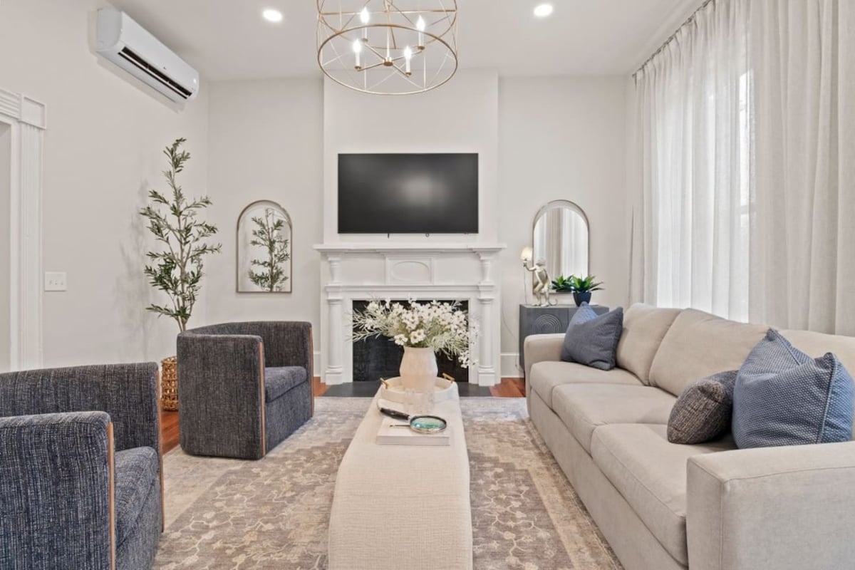 Escape to our cozy 2-bedroom cottage on East Bay minutes from Chimney Bluffs! This retreat sleeps up to 6 guests, featuring two adjustable queen beds and a sofa bed. Enjoy stunning water views, a mounted fireplace, and three Smart TVs for relaxing evenings. The cottage includes a fully equipped kitchen and a large deck with a propane firepit—perfect for cozy nights under the stars. Step out onto the dock for fishing and kayaking, or stay connected at the dedicated work space with fast Wi-Fi.