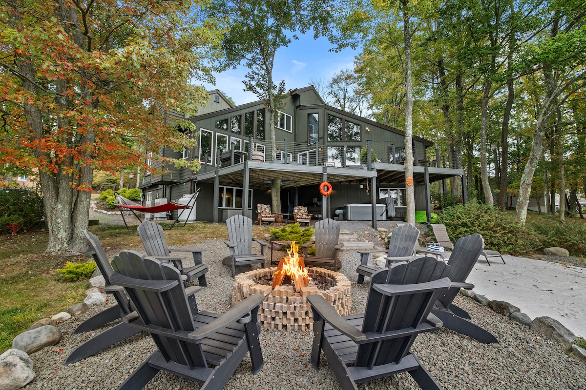 Relaxing getaway on beautiful Lake Wallenpaupack! Escape and wind down with stunning views of the lake on all 3 levels! Centrally located to several Shops, Bars and Restaurants. Included with the property is a small fenced in yard for dogs, 8 person hot tub, giant swivel umbrella, 2 kayaks, 4 person paddle boat, 2 fire pits, 2 hammocks, corn hole game, and lots of board games. A few short steps from the house, enjoy fishing and swimming off the 50’x20’ U-shaped private dock. Bring your boat!