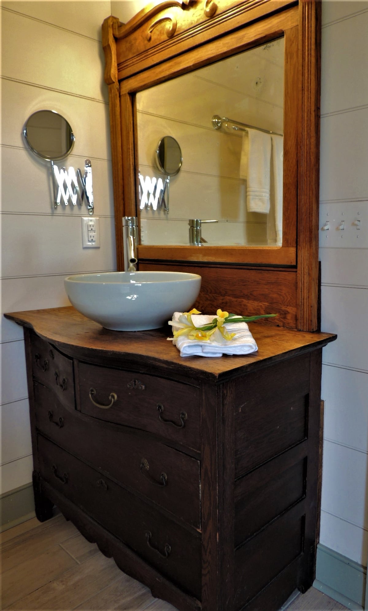The Hiker's Hideway, a room with a private bathroom overlooks the Mill's massive Fritz water wheel. It is furnished with a king bed, sitting area, smart TV (complimentary YouTube TV), usb chargers, free coffee, tea, water, and access to free WiFi. Linens and toiletries are provided. Please note this suite is NOT pet friendly. The cabin is our only pet-friendly option. The suite is also on the 2nd floor up the original (steep) stairs of the Mill house.