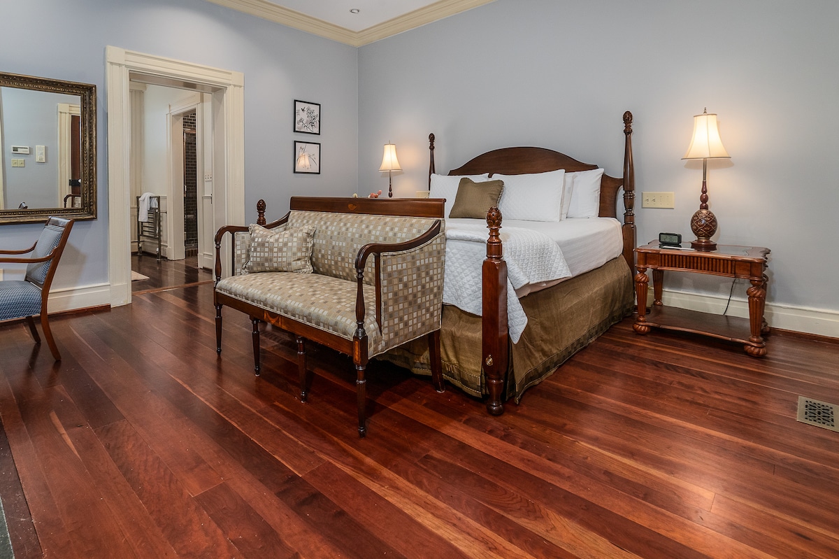 The Red Room is located on the second floor and is a very spacious room with sunrise views of the Blue Ridge Mountains. The red, navy, and tan color palette pays tribute to our Nation's history. The King size spindle bed is fitted with fine linens and a daybed is also available for up to 2 additional guests. The room features a non-working fireplace. The bathroom has a large shower, heated floors and luxurious towels. Also included are plush robes, remote control candles, and TV w/ Roku.