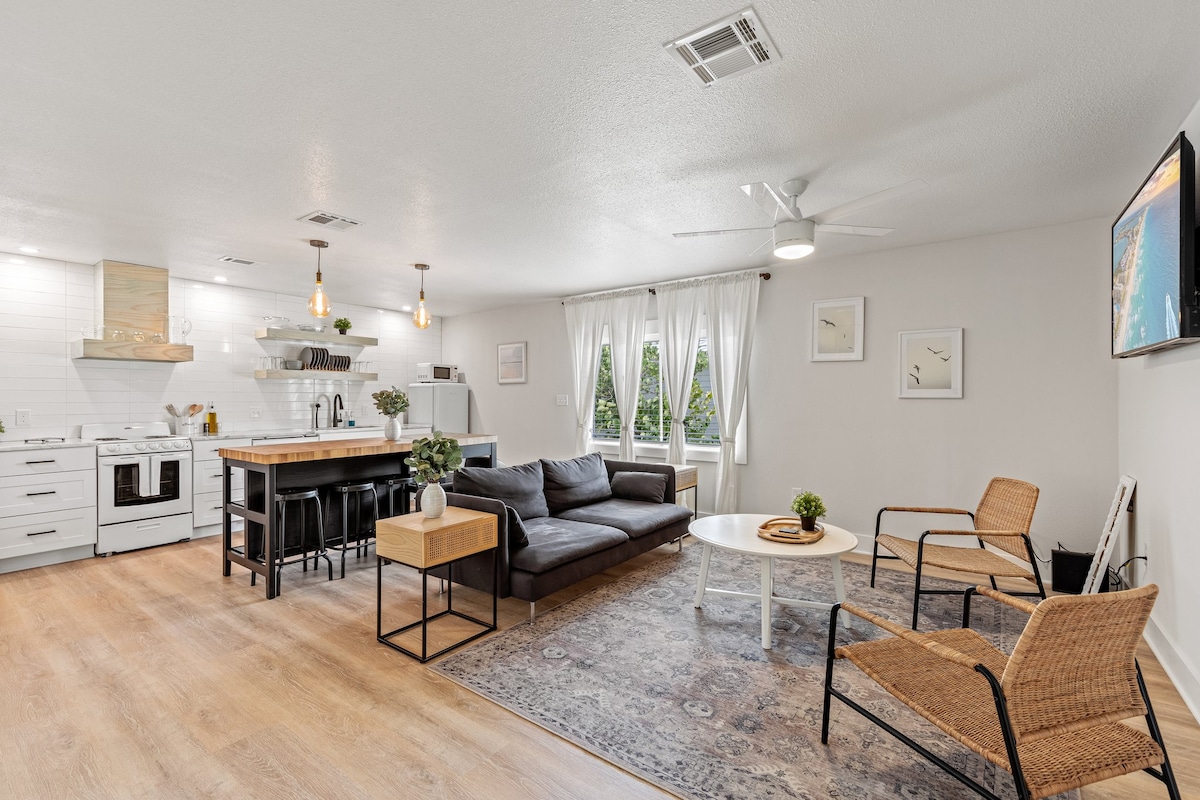 - One block from the Crystal Beach area of Destin - 0.6 miles to Destin Commons w/ Whole Foods and shopping - 1.0 mile to Publix - This is the UPSTAIRS UNIT (downstairs rents separately through same host.) Each unit is fully separate. The Destin Doublemint, a bright and airy one-bedroom cottage, is the perfect spot for your beach vacation. It's less than a 2-minute walk to the sand, making it easy to pop back for a dip in the pool or a movie in the AC before walking back over for sunset.