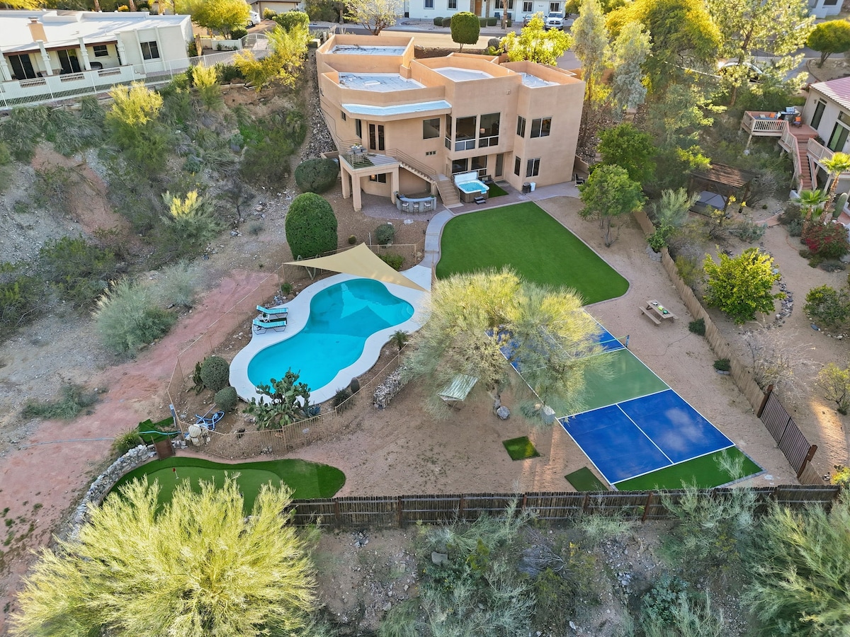 Breathtaking views in all directions! Feel on top of the world. Accommodates up to 12 guests. Spacious open layout, 5500 sq ft custom-built home in Fountain Hills. 4 bedrooms, each with private en-suite baths. Every room opens to a balcony with sweeping 100-mile views. Outfitted with premium appliances. Resort-style backyard is a showstopper. Heated pool available (extra fee). Greet each day with a stunning sunrise. Strict NO PARTY policy in place.