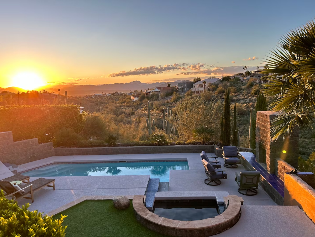 Large guest suite (bedroom & bathroom), with private, electronic keyed entrance from patio looking out on pool, Jacuzzi & pristine views of majestic mountain sunrises and desert landscapes. Portable induction cooktop, microwave, small refrigerator, coffeemaker, table & chairs. Large bathroom with double sink, shower & separate soaking tub. Sitting area for reading, entertainment center with large screen smart TV & internet access. Shared backyard and patio with tables, & BBQ for alfresco dining.