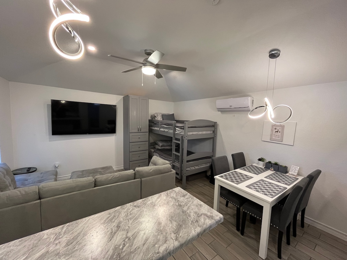 Your family will be close to everything when you stay at this centrally-located place. Our studio apartment is located 6 minutes away from a shopping plaza, where you can find: - TjMaxx - Ross - Heb Plus - Hobby Lobby - Ulta - Burlington - Petco And a lot of dining options.