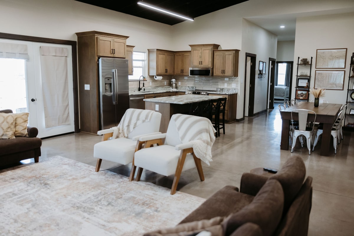 Welcome to Freedom Quarters, a peaceful 2 bed, 2 bath farm stay between Rogersville and Fordland with quick, 20min access to Springfield. Enjoy 1,260 sq ft of comfort with 10–14’ ceilings, a walk-in onyx shower, electric fireplace, custom cabinets, marble countertops, walk-in pantry, & a large covered patio. The kitchen is fully stocked with a 4-person island and 10 seat table. Set on a private farm with Wi-Fi, laundry, and country charm—where freedom feels like home. No animals, no exceptions.
