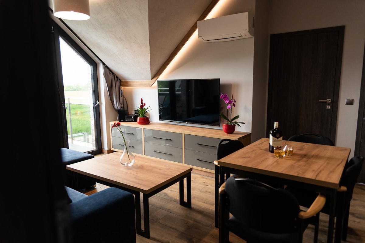 Apartament z dużymi oknami i przepięknym widokiem na jezioro. W apartamencie: salon z rozkładaną sofą, aneks kuchenny (indukcja, mikrofalówka, lodówka, zmywarka), sypialnia z 2 pojedynczymi łóżkami, któe można zsunąć w jedno. Łazienka z prysznicem, wc, i suszarką do włosów.